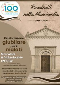 Nell’ambito del Centenario della Chiesa Parrocchiale di Santa Maria dei Bianchi (1926–2026), mercoledì 11 febbraio 2026, alle ore 17:30, si terrà la Celebrazione giubilare per i malati, in occasione della XXXIV Giornata Mondiale del Malato.