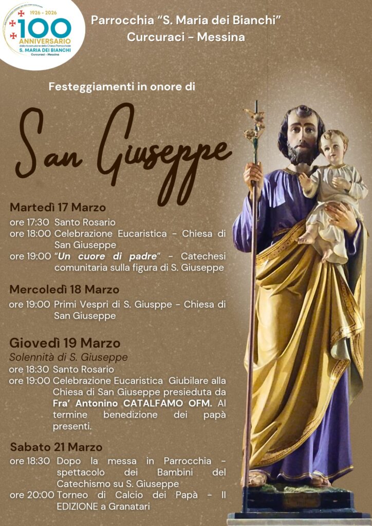 La Parrocchia “S. Maria dei Bianchi” di Curcuraci è lieta di invitare tutta la comunità ai solenni festeggiamenti in onore di San Giuseppe, in occasione del 100° anniversario dalla fondazione delle Chiesa Parrocchiale.
