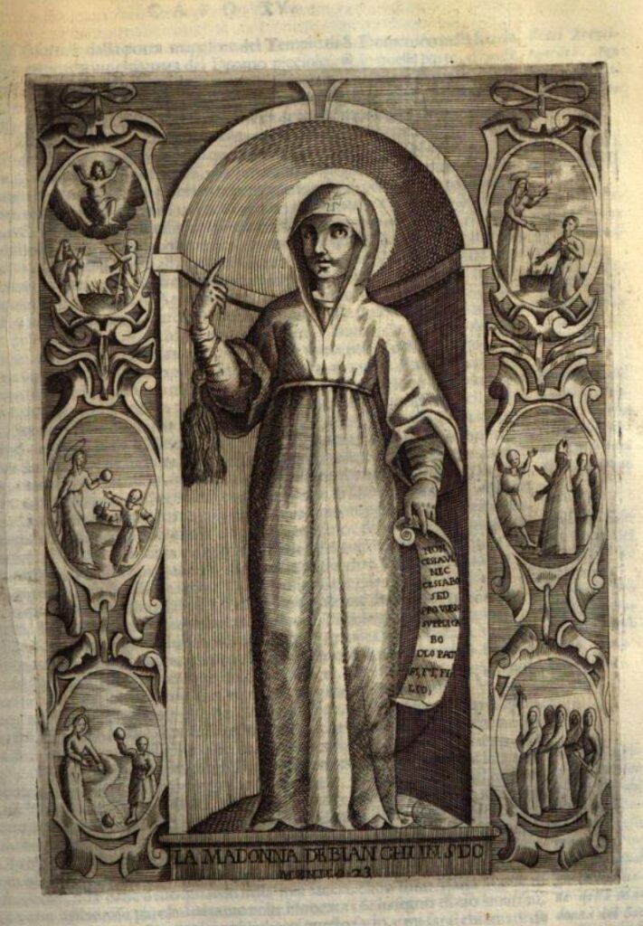 Vedesi al presente in questo Tempio [S. Domenico Patriarca] un solo vestigio de’ Templari rimasto, è una Imagine della B. Vergine, che à bello studio hò in questo luogo riserbata, sotto titolo de’ Bianchi, in una Cappelletta vicino alla porta, ch’entra nel Chiostro, dipinta a fresco, il cui vestimenti è bianco, segnata nella fronte con la Croce rossa de’ Templari, & intorno alla Imagine vi stà in diuersi partimenti dipintia vn’ Historia, la quale riferirò in questo luogo, conforme l’hà raccontato D. Siluestro Maurolico, venerabile Abbate, e dice d’haueria intesa per bocca di suo Zio huomo non di poca autorità, l’Abbate D. Francesco Maurolico, e come quella, & altre antiche dipinture tacitamente l’affermano.